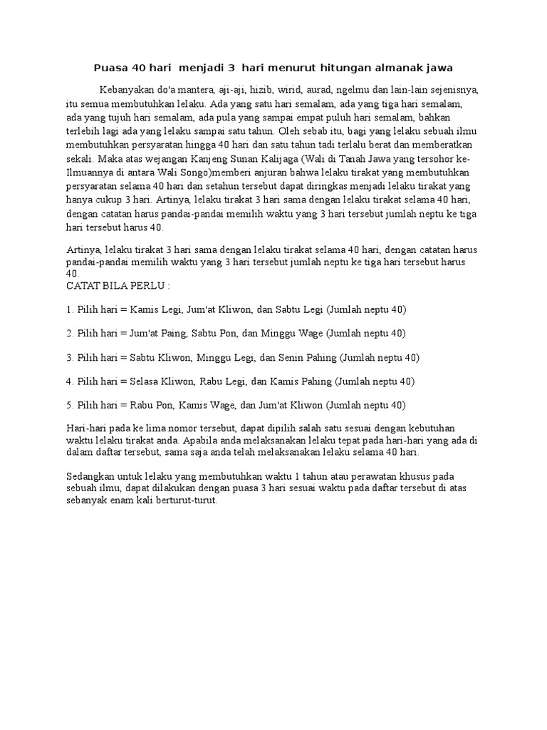 Pitutur Jowo Dalam Melakukan Hajat Perkawinan Mendirikan Rumah Bepergian Dan Sebagainya Kebanyakan Orang Jawa Dahulu Mendasarkan Atas Hari Yang Berjumlah 7 Senin Minggu Dan Pasaran Yang Jumlahnya Ada 5 Tiap Hari Tentu Ada from lookaside.fbsbx.com We did not find results for: Check spelling or type a new query. Maybe you would like to learn more about one of these?